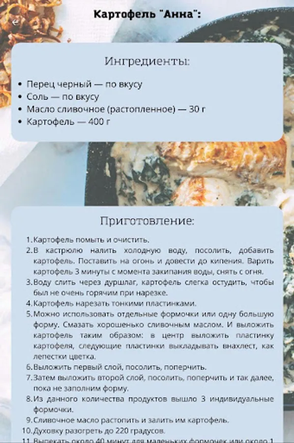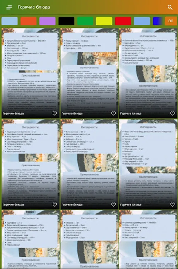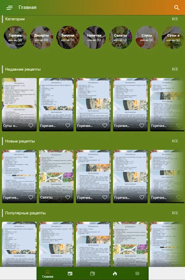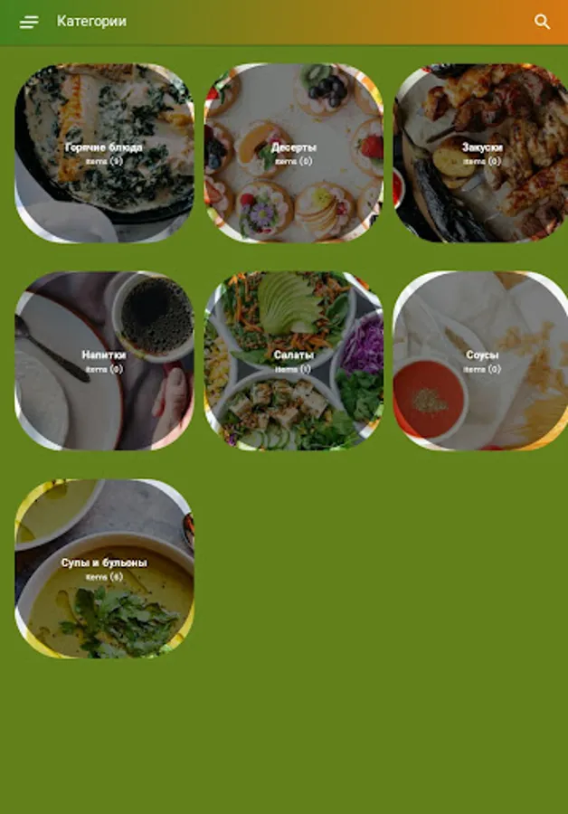 The application contains the following categories of recipes: Soups and broths, Hot dishes, Salads, Snacks, Pastries, Desserts, Sauces, Drinks.