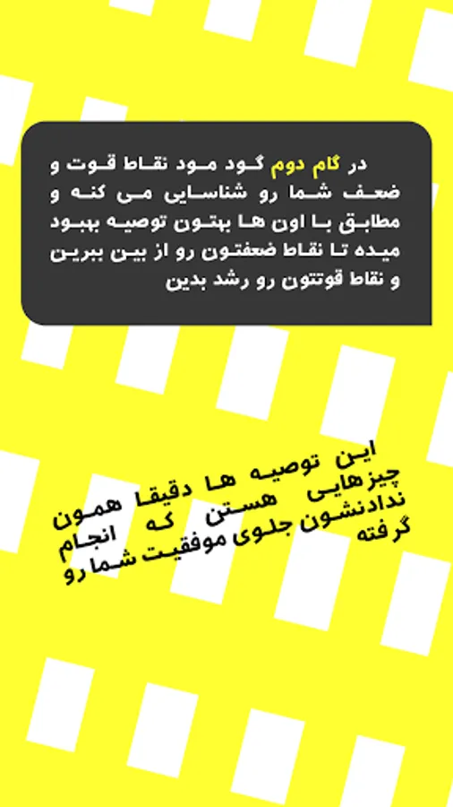 A total of 18 main recommendations, each of which includes a number of sub-recommendations, are considered for each person, and obtaining a quorum of points in each recommendation means that the user has grown enough in that recommendation and is one of the weaknesses. Has turned itself into a strength or has developed its talent in a particular field.