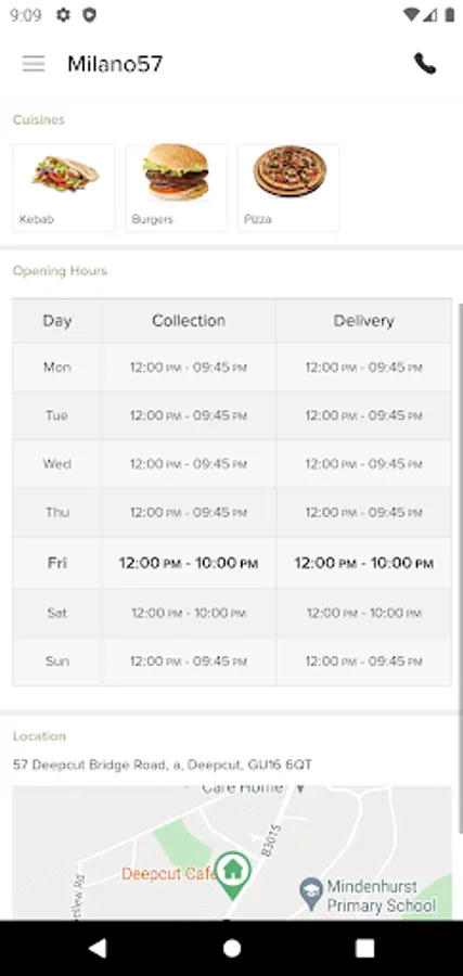 Order food online in Deepcut! It's so easy to use, fast and convenient. Try our new, online app which contains our entire takeaway menu. The Milano 57 is located in Deepcut.