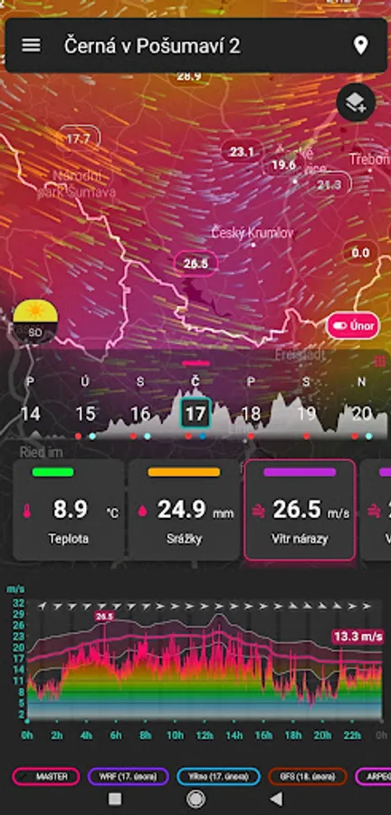 Our weather forecast is available for absolutely any place in Europe, whether it is a city, village, solitude or water area. In addition, we specialize in those interested in wind sports and weather in the Czech Republic. Unlike other applications with a given topic, we not only take over the information, but we also calculate it ourselves.