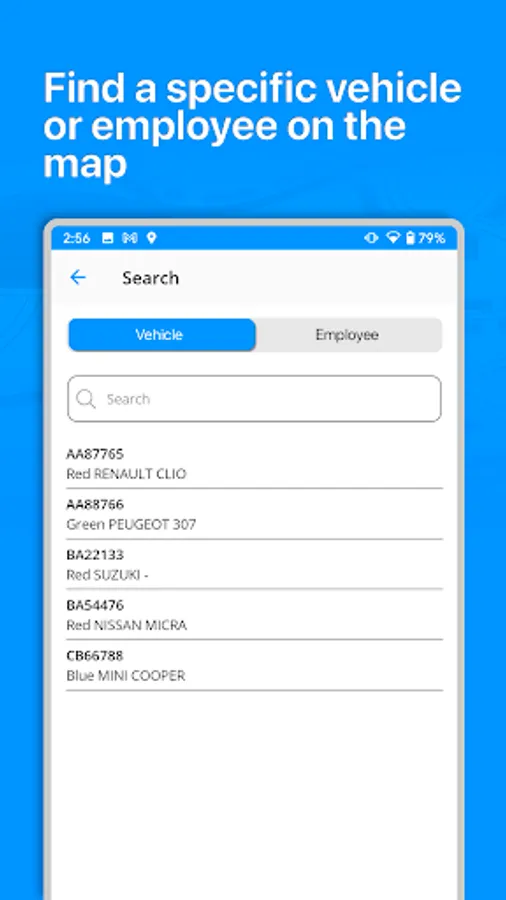 - Find vehicle on map by license plate number or employee allocated to the vehicle