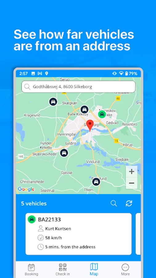 In the app, some employees can be given access to see where the organization’s vehicles are on a map.