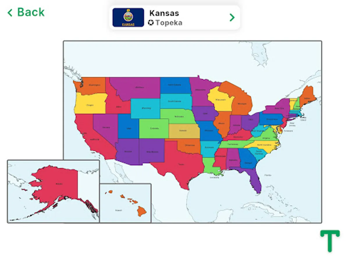 This app has a political world map on which you can find the location and border of various countries. Also it has addition menu where you can find a lot of additional content. At this moment it has one addition “States of the Unites States” where you can learn state’s location, flag, capital, area and population