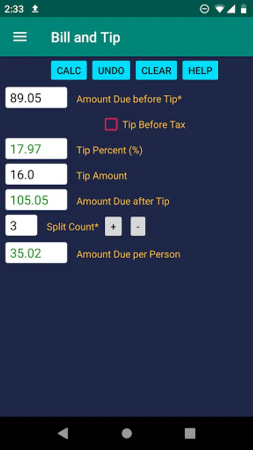 1. Bill, tip and tax amount calculation with a multiple-person split feature. Tip percent can be applied to the bill total before or after sales tax.