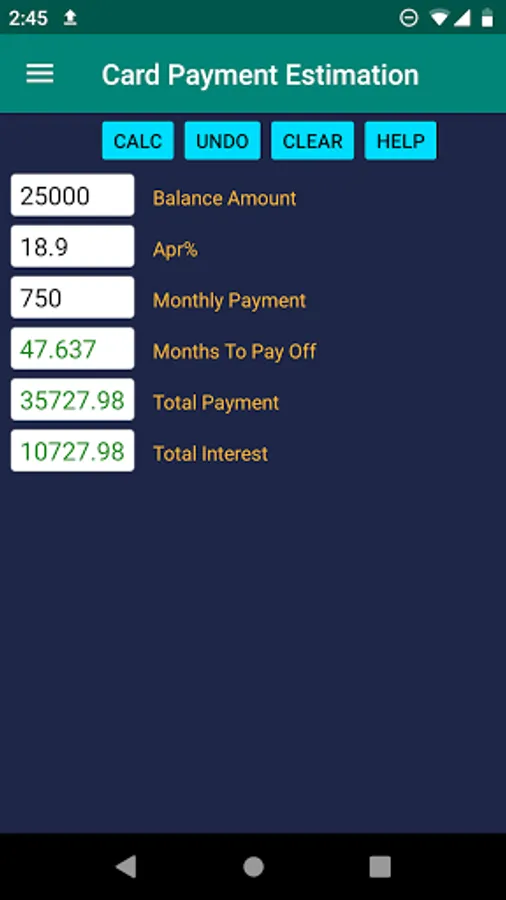 5. Credit card monthly payment for payoff, duration and total interest calculation.