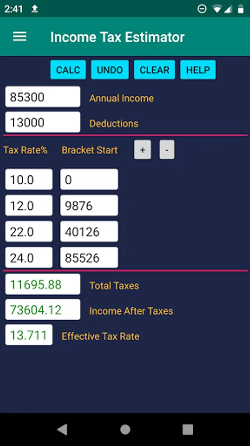 17. Income tax calculator for multiple tax rate brackets with deductions.
