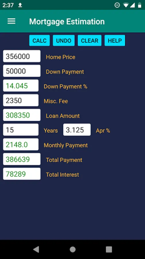 6. Mortgage down payment, loan amount and monthly payment calculation.