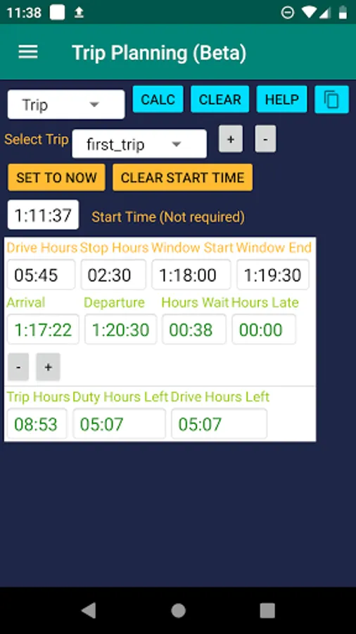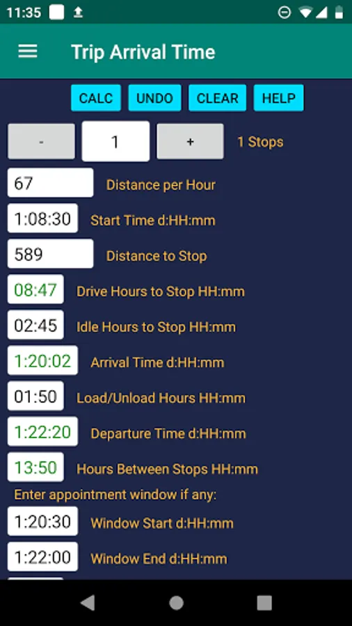 5. Trucker trip mileage, arrival, departure time calculation for load, unload stops with time window (considering driving, non-driving, wait and late hours).