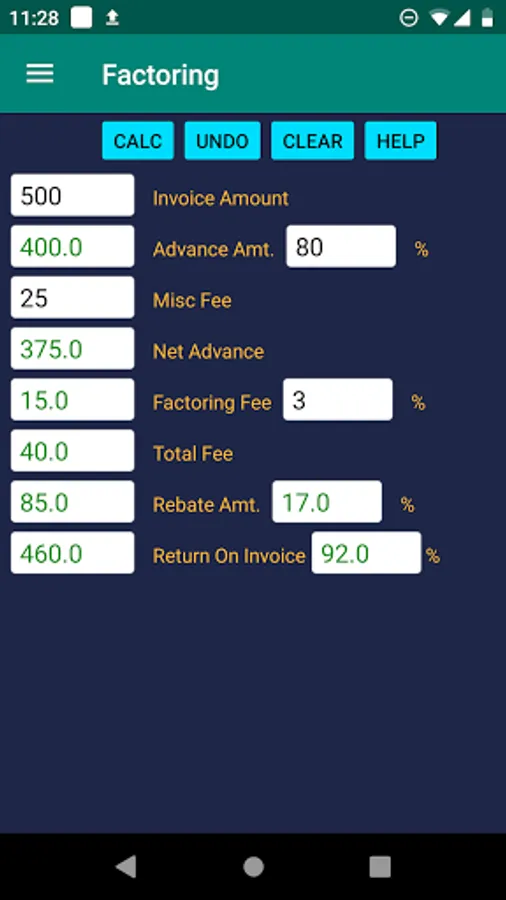 8. Freight shipment invoice factoring calculator for advance amount, fee and rebate.
