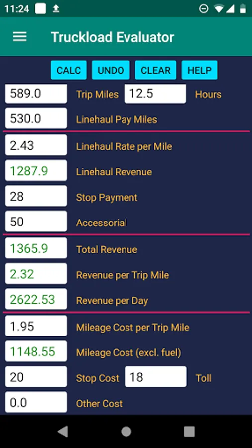 2. Truckload cost per mile, revenue, profit and trip fuel cost calculator.
