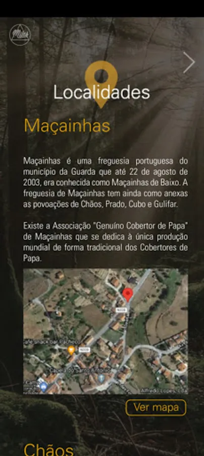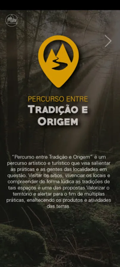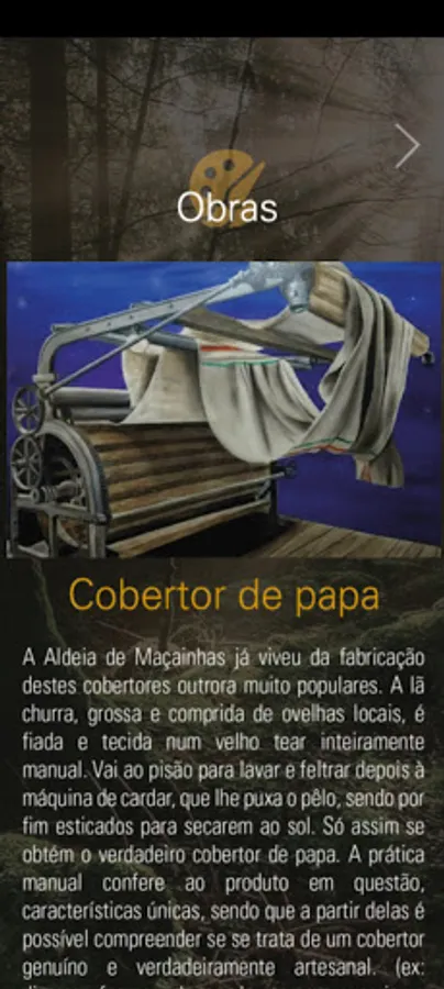 The "Tradition and Origin" application allows visitors to the localities of Massainhas, Chãos and Cubo to view interactive works of art sequentially aligned in an artistic/tourist route that aims to highlight the practices developed in the regions, from the production of the pap blanket, to the foundry activity. The themes, in addition to being addressed in several painted works, are also explored through the application "Tradition and Origin".