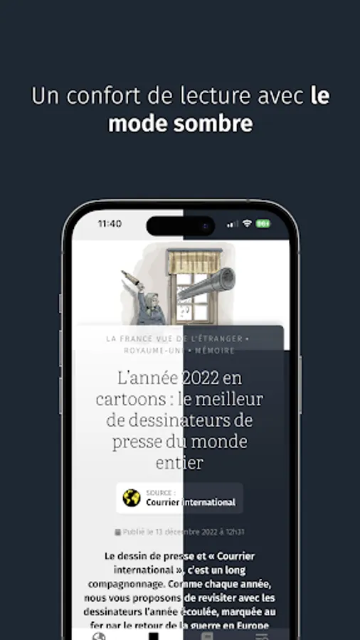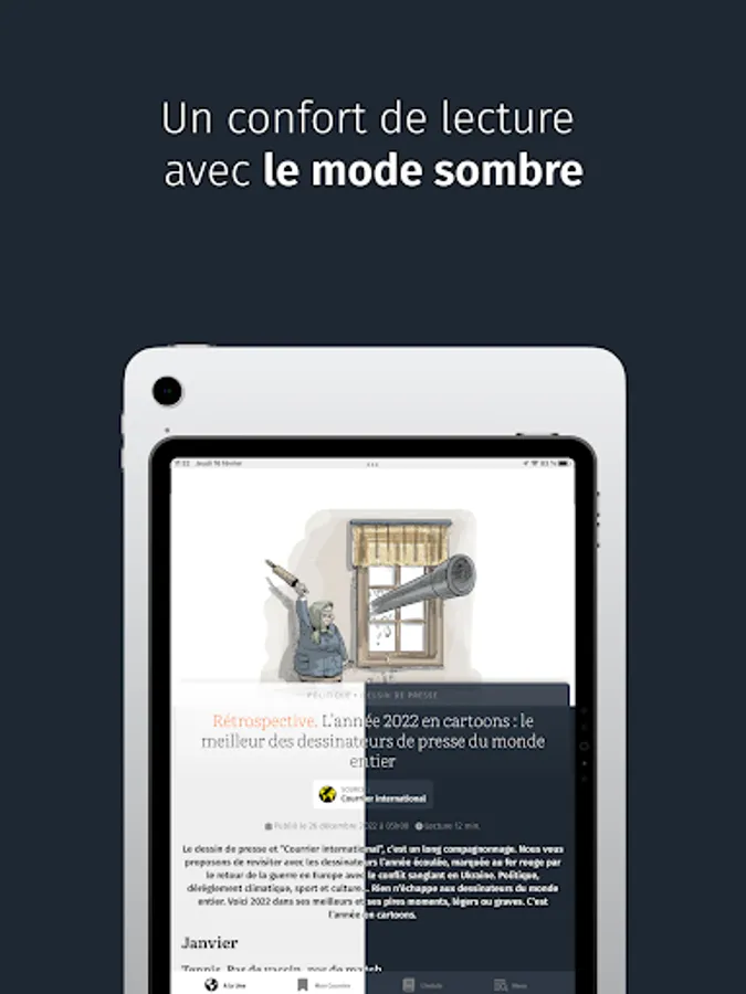 • Settings. Personalize your app. Sign up for notifications to be kept up to date with the latest news, opt for dark mode and choose the text size for better reading comfort.