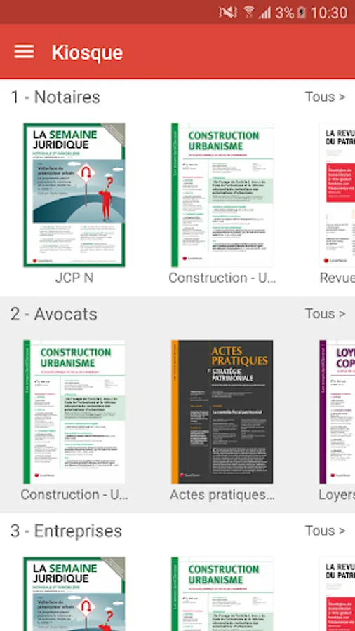 The range of magazines available in LexisNexis Lexis Kiosk covers any legal developments and meets the different needs of each legal professional: it in fact includes all LexisNexis weekly (five weekly editions of the Week Legal - JCPG, JCPN, JCPE, JCPA, JCPS - and the tax Law review) and specialized monthly and quarterly reviews.