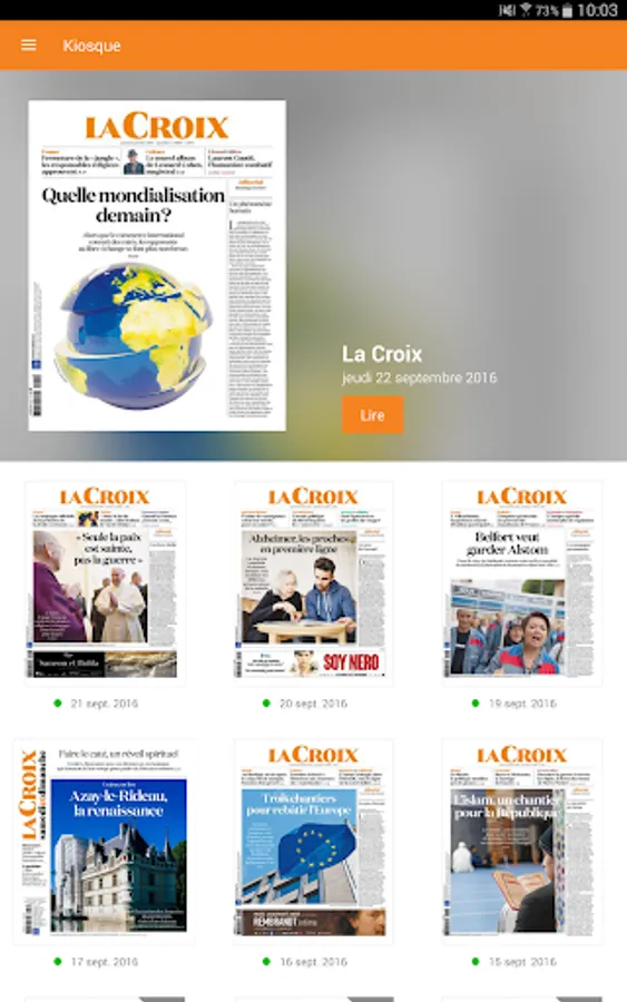 You access the newspaper La Croix on mobile and tablet, from 23h on the day before publication. Even offline, you keep reading your articles, with the ability to download editions you want to keep.