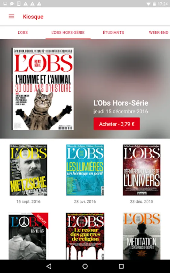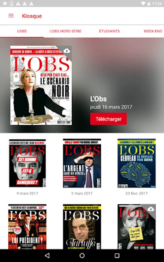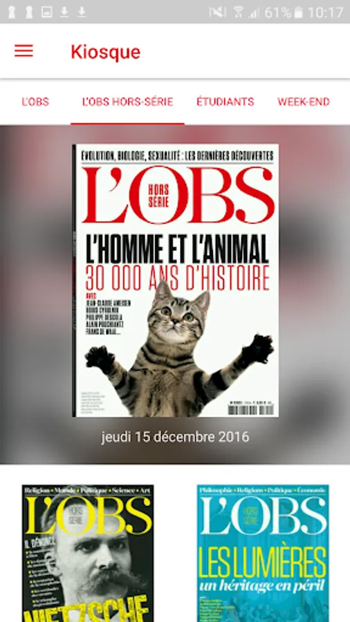 This application is a digital magazine. It provides access to the magazine Obs first weekly news magazine in France, as well as its thematic supplements (TéléObs, Obsession) and its regional editions.