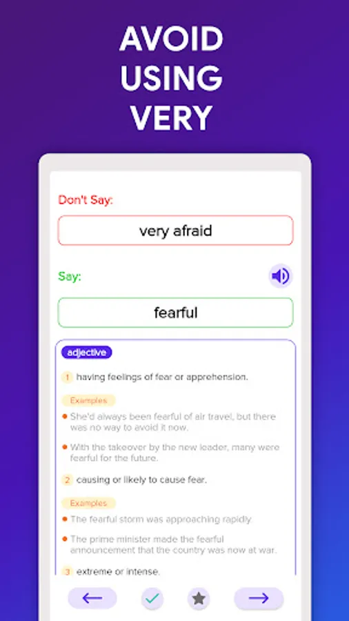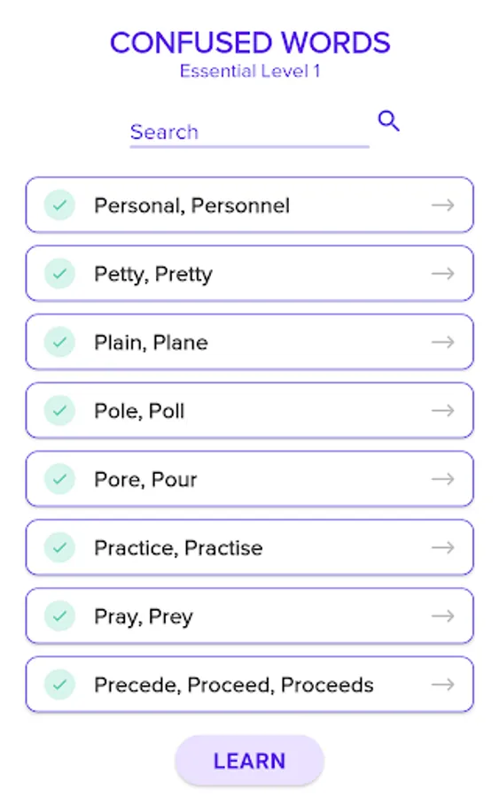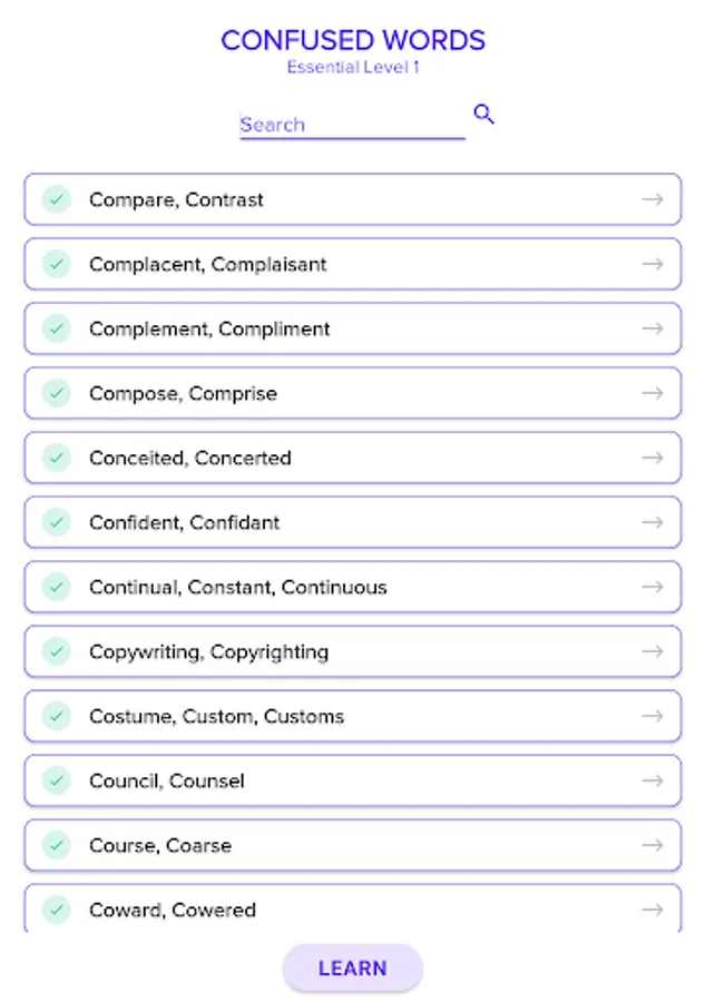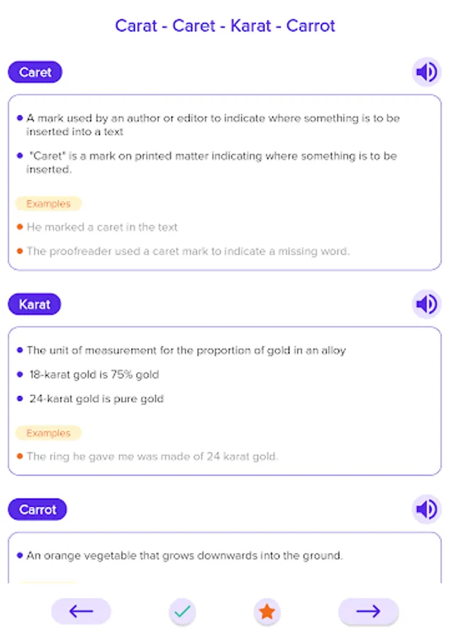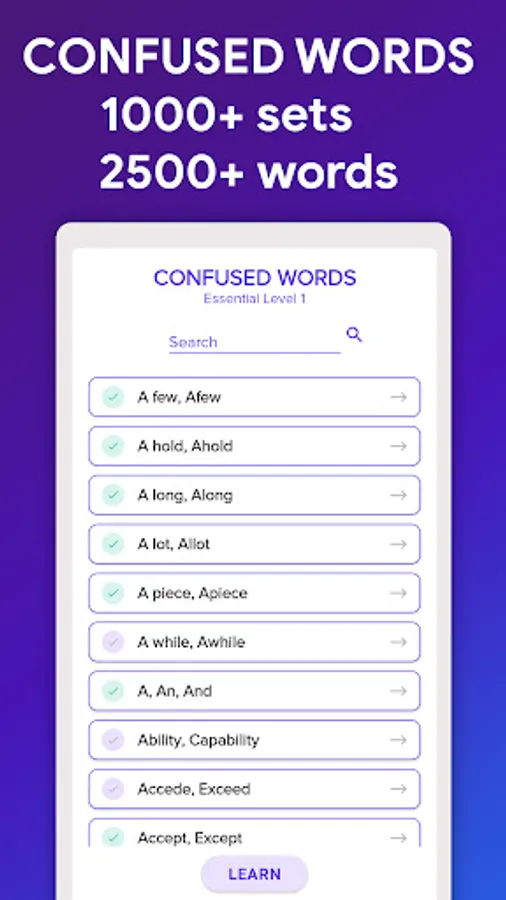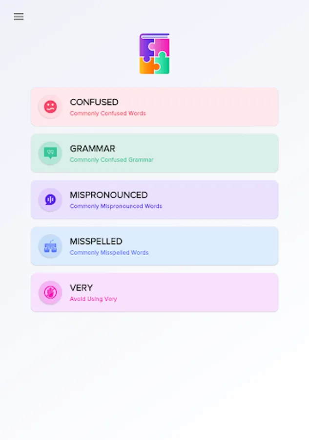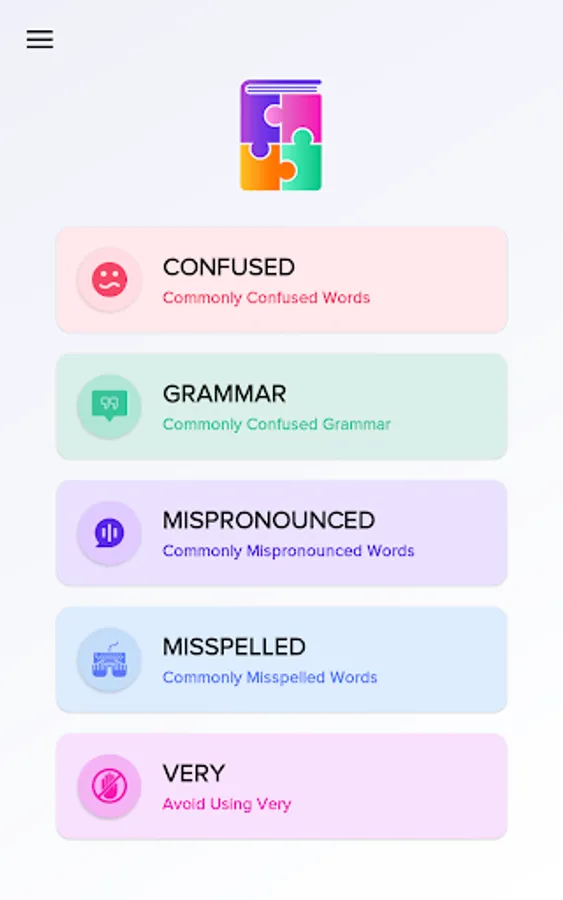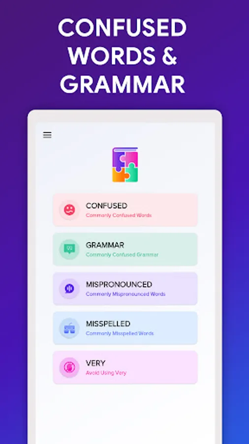 Well, you can also find more interesting parts in Confused Words app such as "Confused Grammar", "Mispronounced Words", "Misspelled Words", "Avoid Using Very" and many tests to improve yourself.