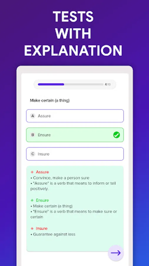 There are many tests in each parts of Confused Words application and you can practice, evaluate and improve your English language.