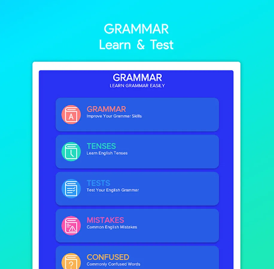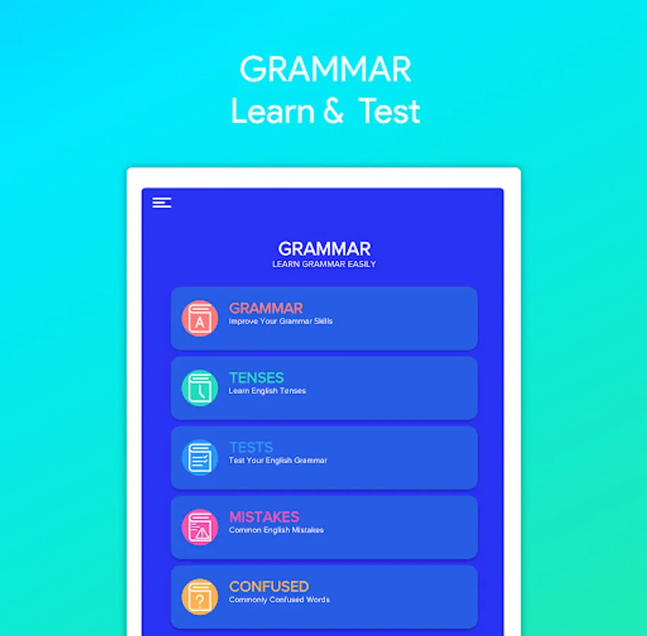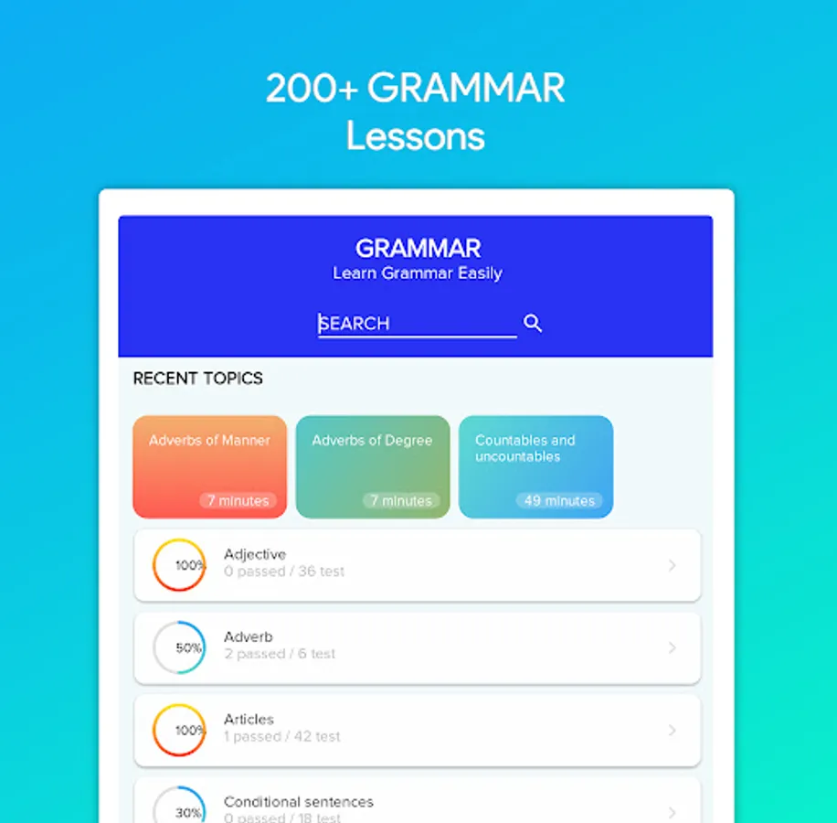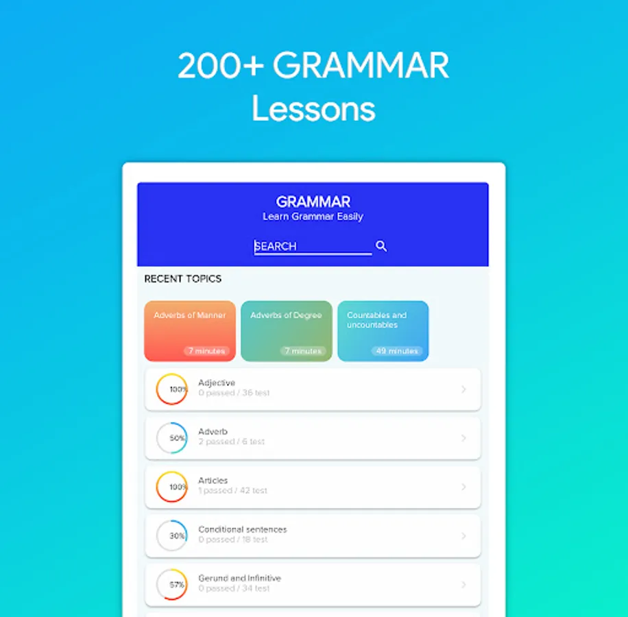 English Grammar app makes it easy to improve your English grammar and get ready for an English grammar test or just improve your writing and speaking quickly. With English Grammar app, you can study for FREE with 300 grammar lessons and 20000 tests (10000 with explanation). Best of all, you can access these features anywhere and anytime when you download our app.