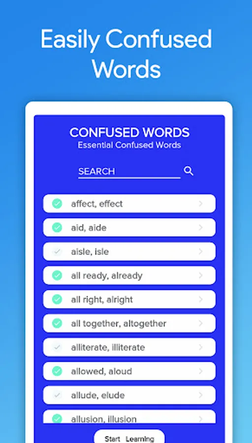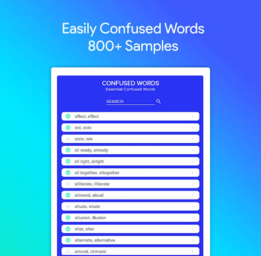 (New feature)This section contains a lot of commonly confused words. They either look alike, sound alike or, worst of all, look and sound alike but have completely different meanings. Other words look and sound different but are similar in meaning, and it’s hard to determine which is the correct one in a given context.