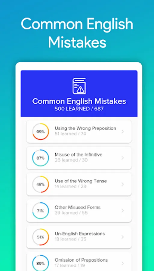 300 grammar lessons and 20000 grammar questions will gradually improve your skills. When you complete your English test you see which aspects of English grammar you are good at and which of them require more practice. Prepare for IELTS, TOEFL, SAT, MCAT, LSAT, GMAT and GRE.