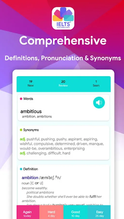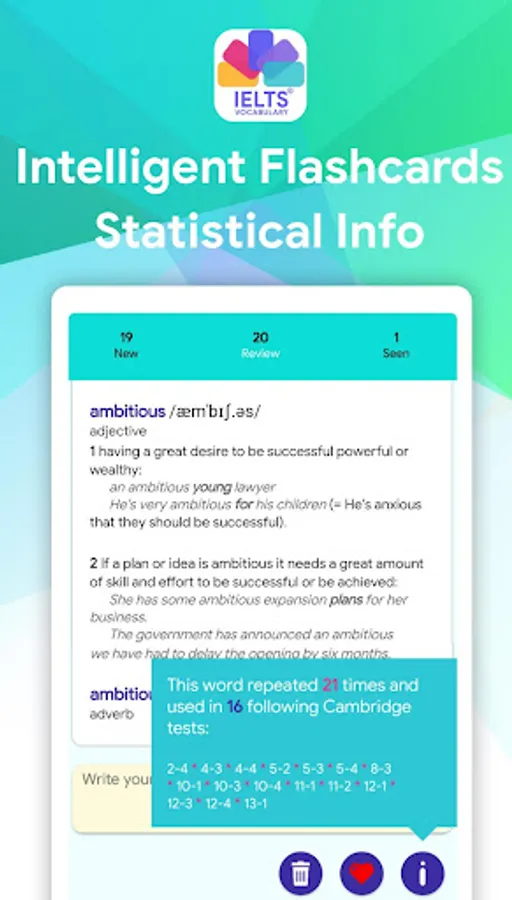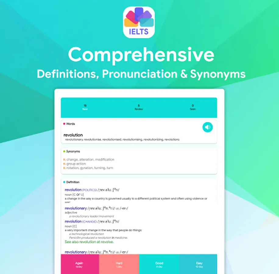 The words smartly extracted by their repetition and importance in 52 tests from Cambridge tests. The Cambridge tests are a set of full-length practice IELTS tests (13 books are covered and each book contains 4 full length test - we will add 14th book as soon as possible). Definitions, Synonyms, Phonetic and Pronunciations are presented.