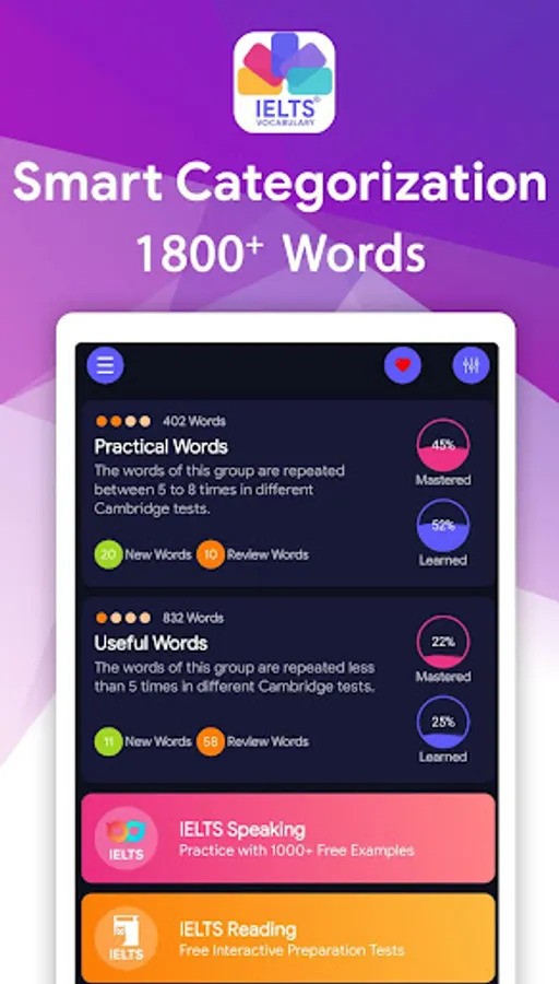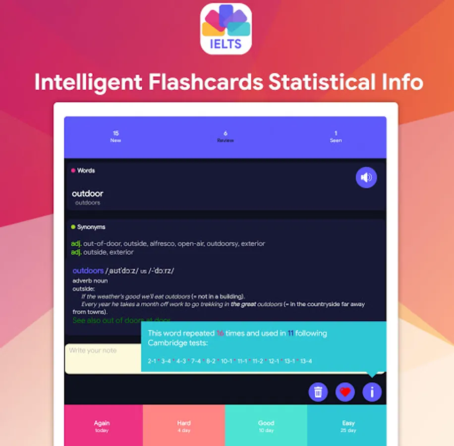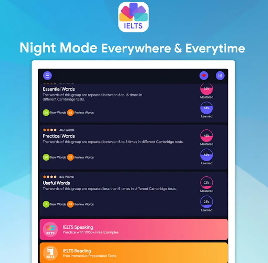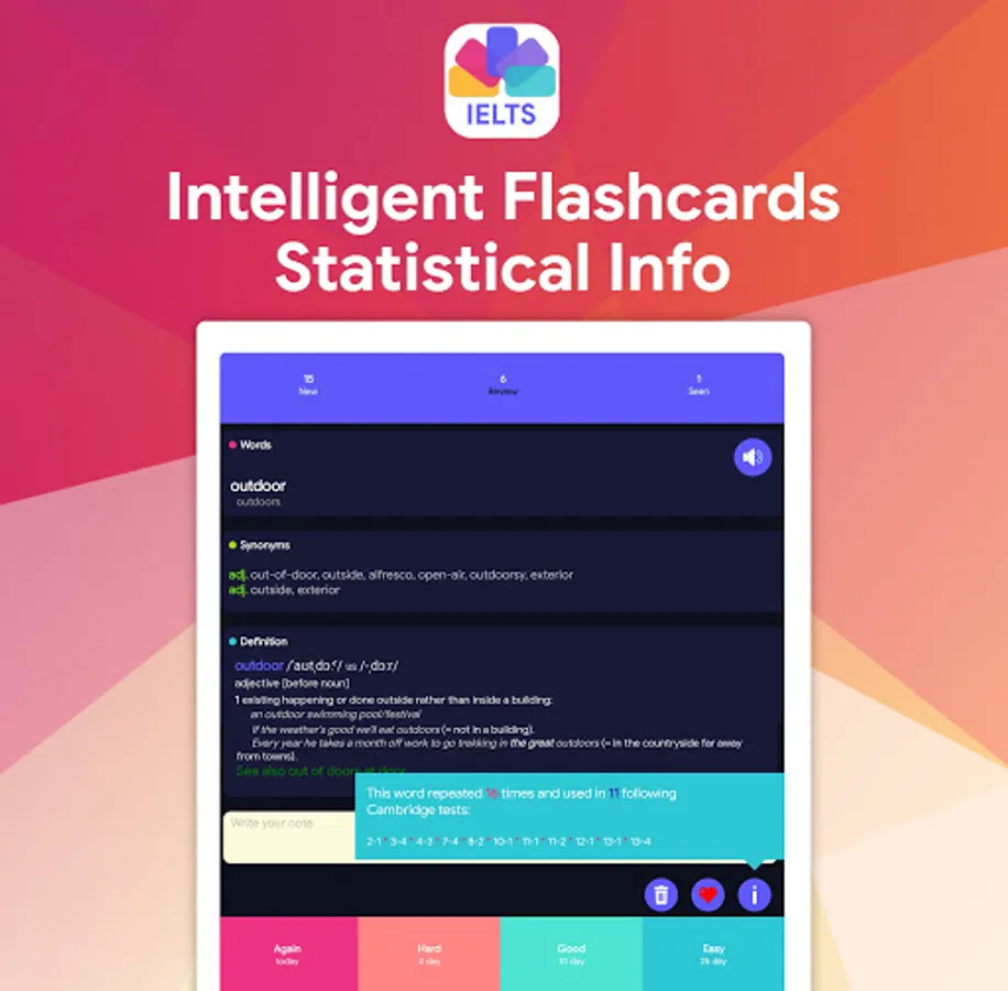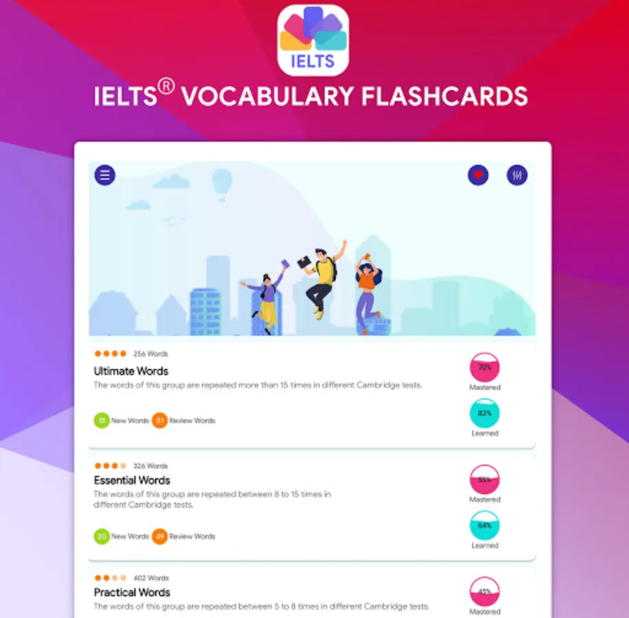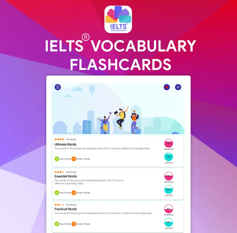 The International English Language Testing System (IELTS) became the world’s most popular English-language test for study, work and migration purposes. IELTS Vocabulary Flashcards is the app that covers the most important words used for the real IELTS exam and help you to achieve your goals.