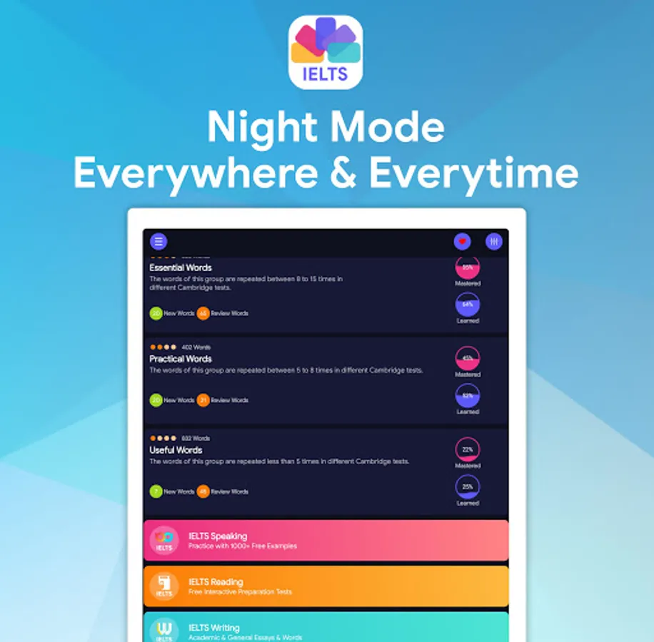 The learning technique, applied in the application, allows you to quickly learn new English words, which are often used in the IELTS tests. It will give huge support for all of IELTS Listening exercises, IELTS Reading practice, IELTS Writing and IELTS Speaking modules.