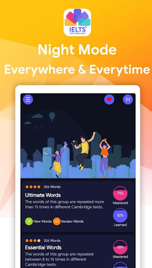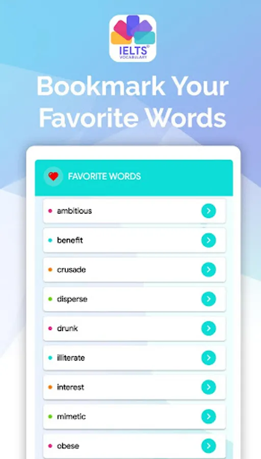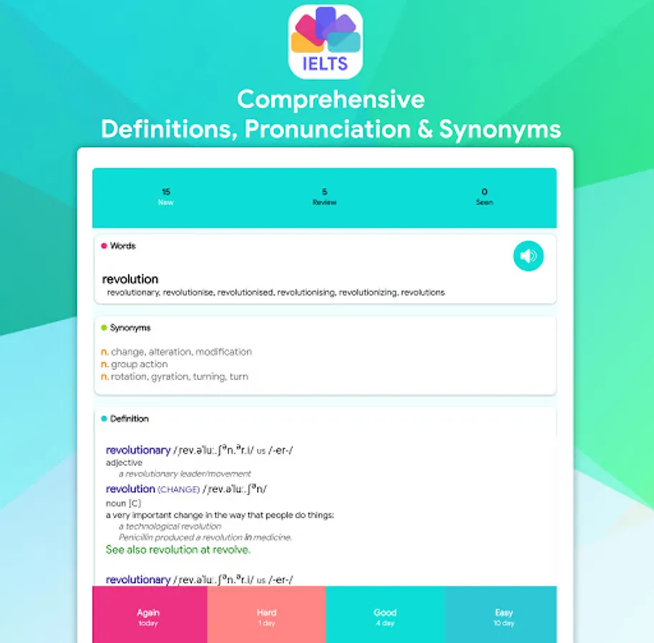 Words and definitions you’re learning will reappear on flashcards to help you learn them faster, appearing less and less frequently as you know them better. Our IELTS Vocabulary Flashcards contain the most important English words you should learn for the IELTS test, making sure you don’t waste your time learning unimportant vocabulary.