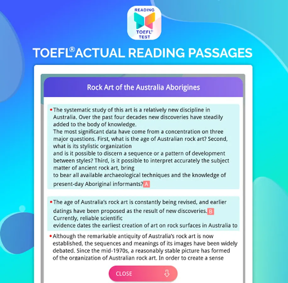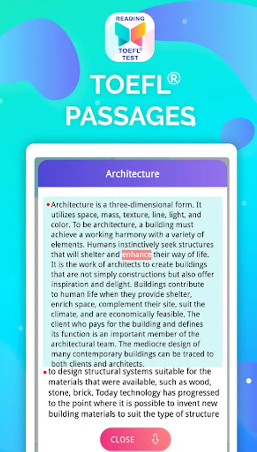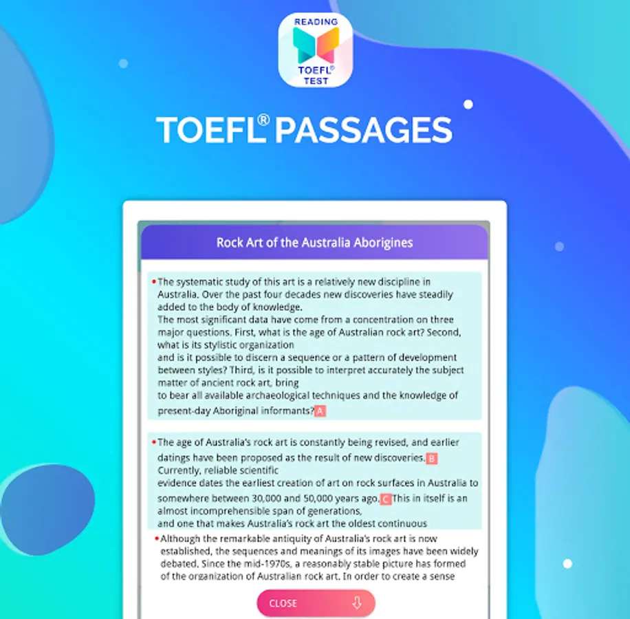 TOEFL® Reading Test app makes it easy to improve TOEFL® Reading score for its users who aiming for a high score in TOEFL® Reading. With TOEFL® Reading Test app, you can study for FREE with our questions, practice tests, vocabulary, and score reports with solutions. Best of all, you can access these features anywhere and anytime when you download our app.