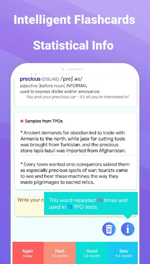 The words smartly extracted by their repetition and importance in nearly 54 TPO® tests. The TPO® tests are a set of full-length practice TOEFL®s that were used for real tests in previous years. Samples, Definitions, Synonyms, Phonetic and Pronunciations are presented.
