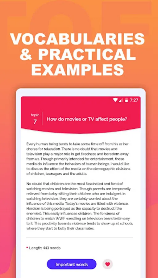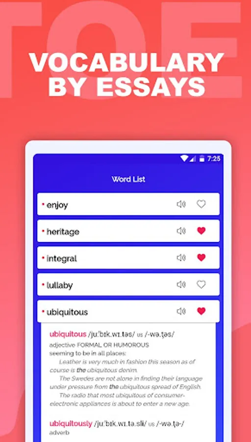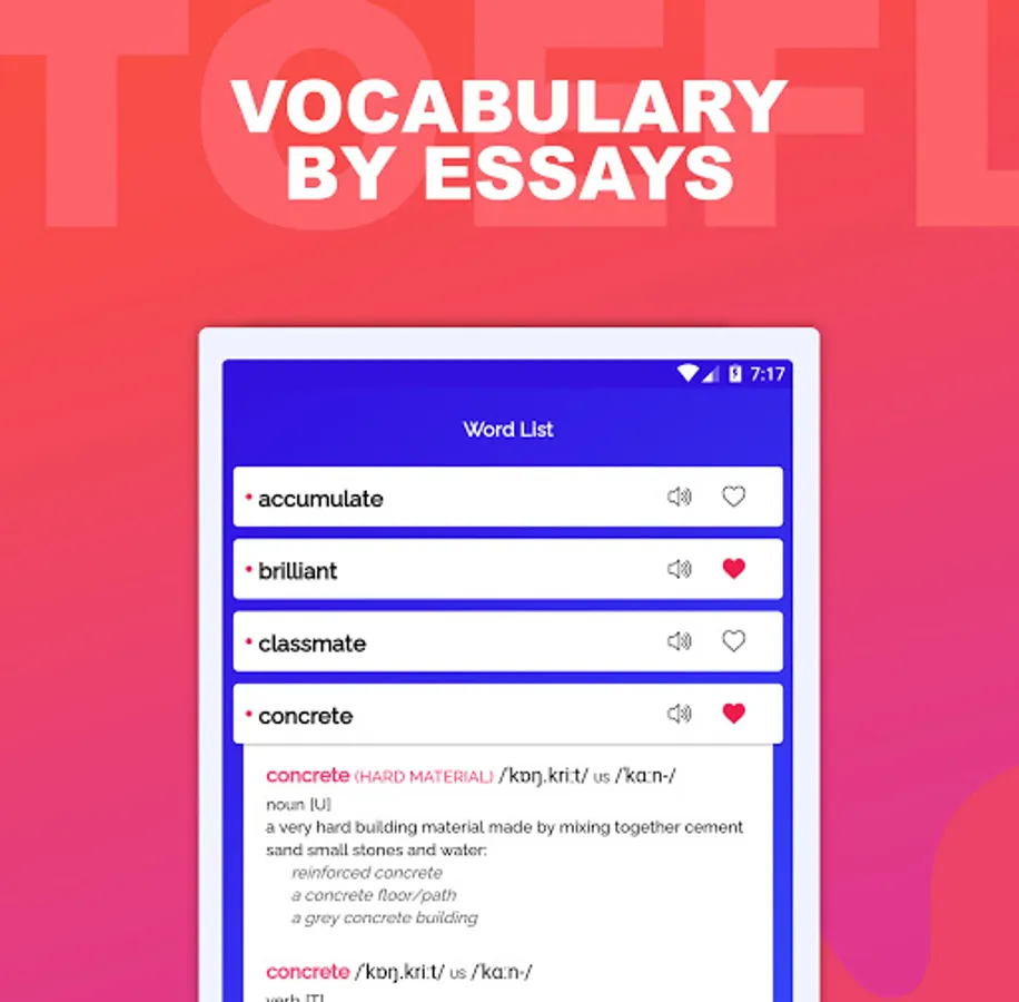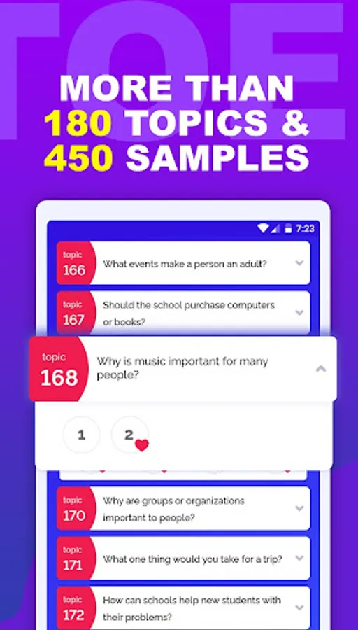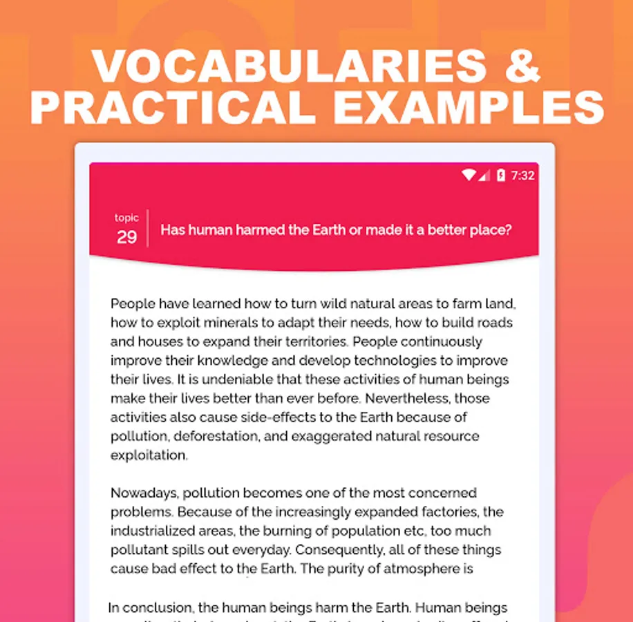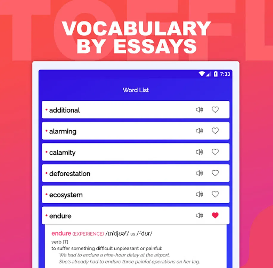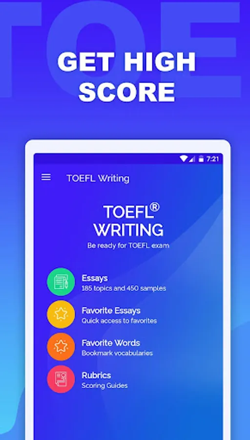 TOEFL® Writing for the writing section of TOEFL® gives you 185 question topics with 450 sample essays and meaning of words which used in them. This app allows you to effectively express yourself in standard English writing, and to get a high score on the TOEFL® test. TOEFL® Writing application easily improve your writing skills with useful and standard sample essays.
