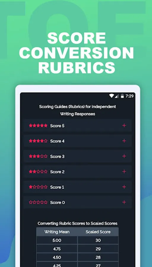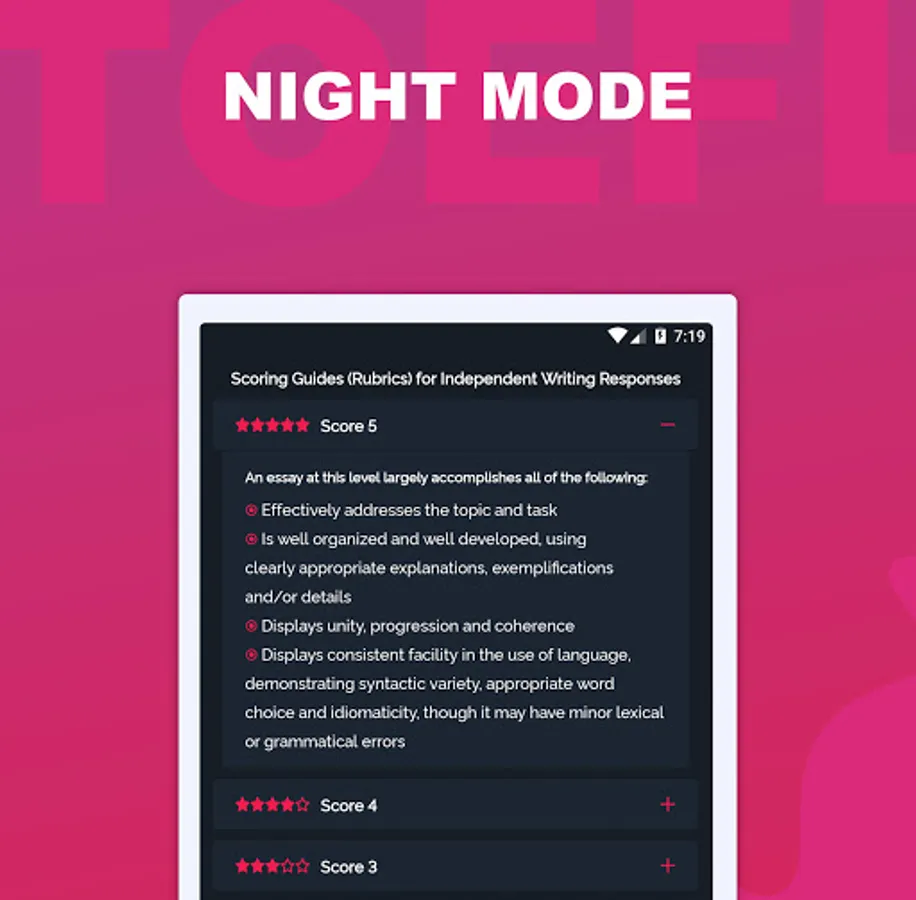 The TOEFL® Writing application provides helpful questions, examples, tips, vocabulary lists and meanings, rubrics and score conversion to help you improve capabilities in addressing TOEFL® Writing task.