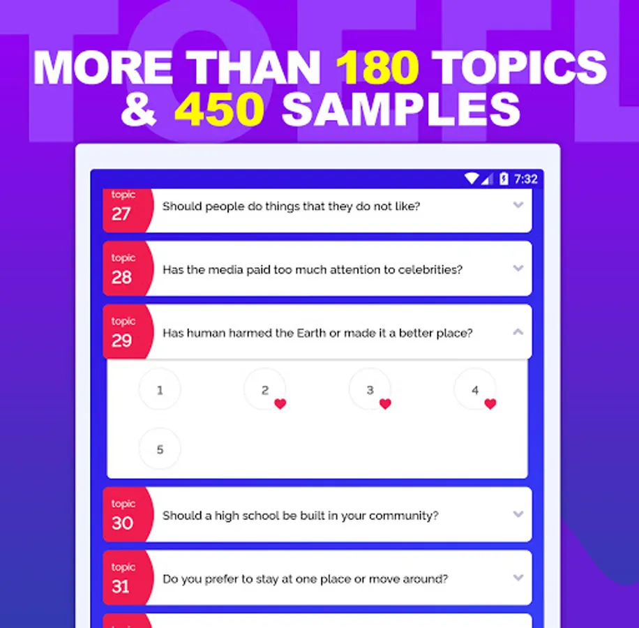 For the Independent Writing task, you’re receiving a question on a particular topic or issue. You’ll have 30 minutes to plan and write a response to that topic that explains your opinion on it. You’ll need to give reasons that support your decision. It’s recommended that your response to this task be at least 300 words. So we provide 185 essay topics which each essay has several standard sample answers. Students actually don't know how to brainstorm and use their time and brain in this task. To solve this problem “TOEFL® Writing" app comes here. Study a huge variety of topics and samples and get ideas from them.