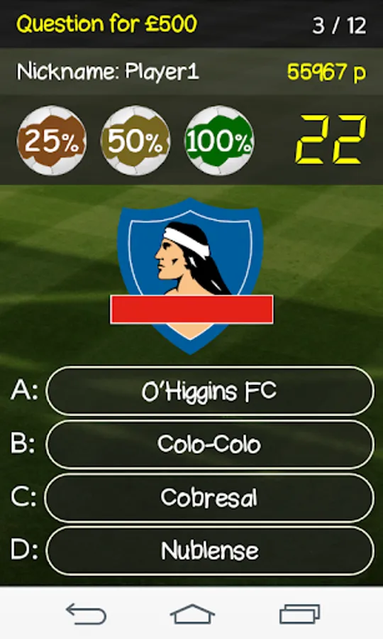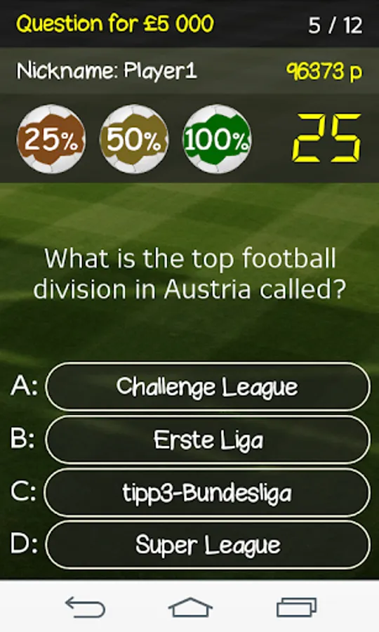 The Football Millionaires game is designed for all fans of football. To win a virtual million you have to answer correctly 12 football related questions at a varied difficulty level: easy, medium and difficult. The database contains over 650 questions, and new questions are constantly added. To each question there are 4 answers, only one is correct. You have 30 seconds to answer each question. You can use a maximum of 3 hints: