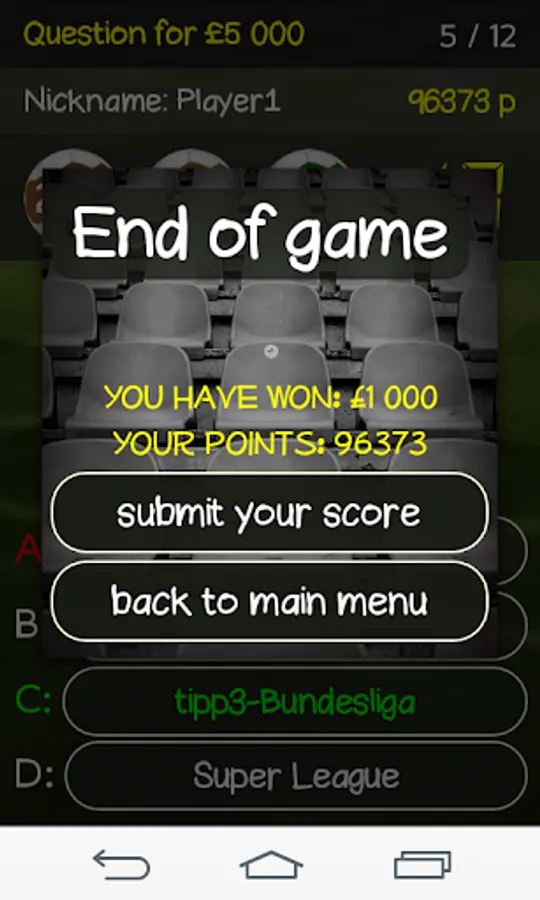 The game ends when you answer correctly 12 questions, give wrong answer or fail to provide an answer withing 30 seconds. Points are awarded in addition to virtual money.