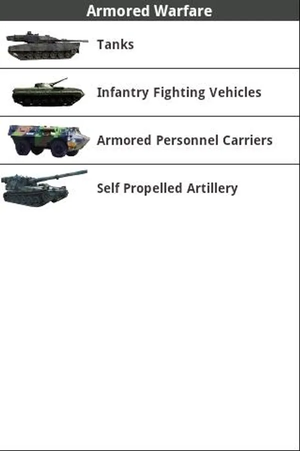 - Armor Encyclopedia are differentiated into easy to recognize categories such as Tanks, Infantry Fighting Vehicles, Armored Personnel Carriers, and Self-Propelled Artillary!