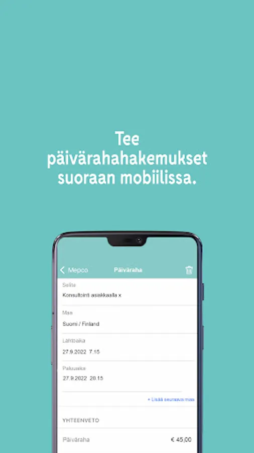 With the Mepco Matka solution, you handle all stages of processing travel, expense and reward transactions, from entering transactions to income register notifications. You can focus on the essentials yourself, because with the solution you automate the necessary accounting, payment and income register reporting processes as far as possible. You can use the solution completely mobile regardless of time and place.