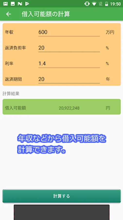 自分の年収/返却予定期間/WEBなどで調べた金利から、以下の内容を計算できます。