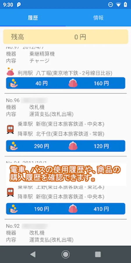 suica, PASMO, manacaなどの全国共通交通系ICカード(サイバネ規格)の記録を表示するアプリです。