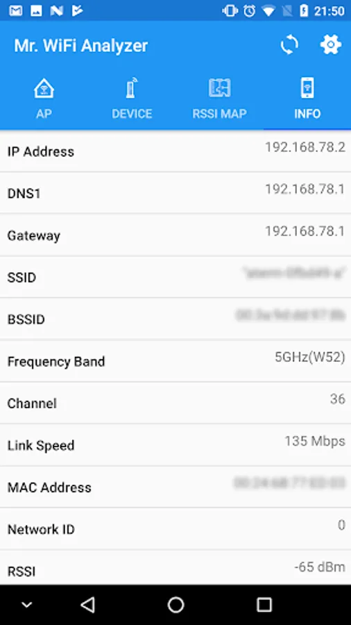 Displays the IP address of the device connected to Wi-Fi, the SSID/BSSID of the connection destination, signal strength, link rate, etc. You can use it to check the network connection details of your device.