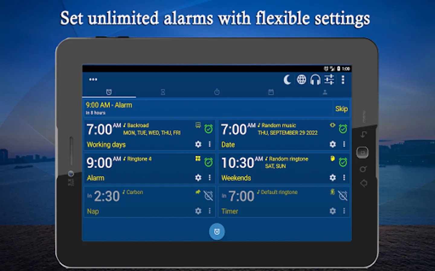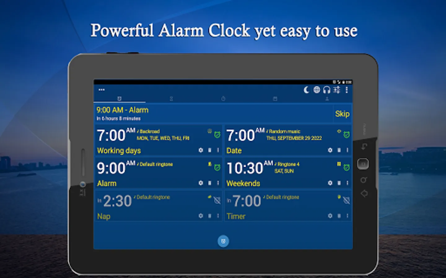 Alarm Plus Millenium includes the same alarm clock + Stopwatch + Timer as the free version without ads and with ability to skip next alarm up to one week.