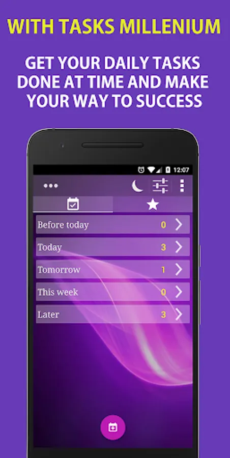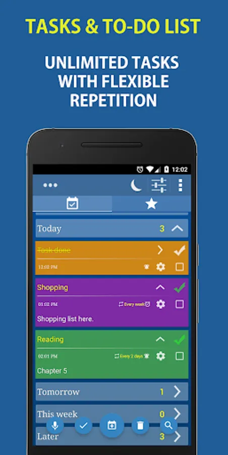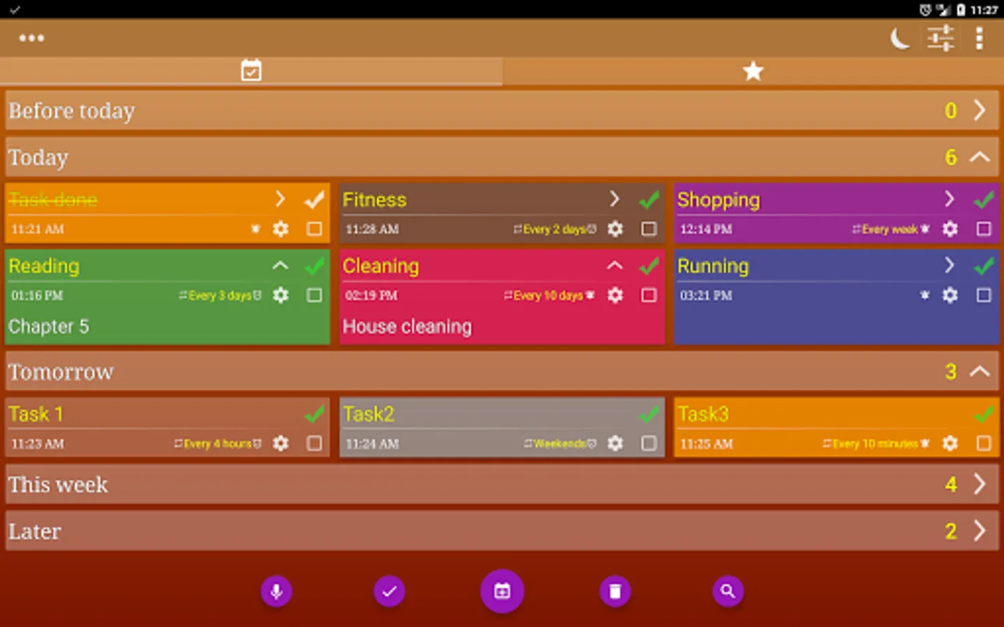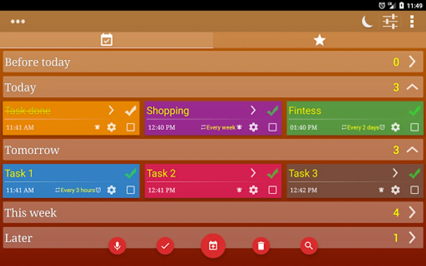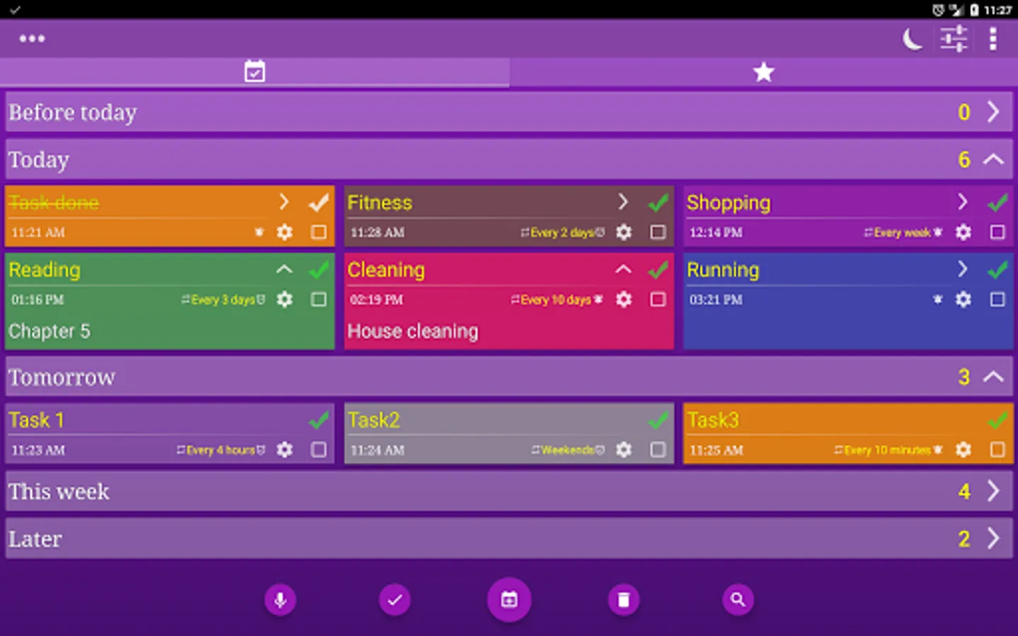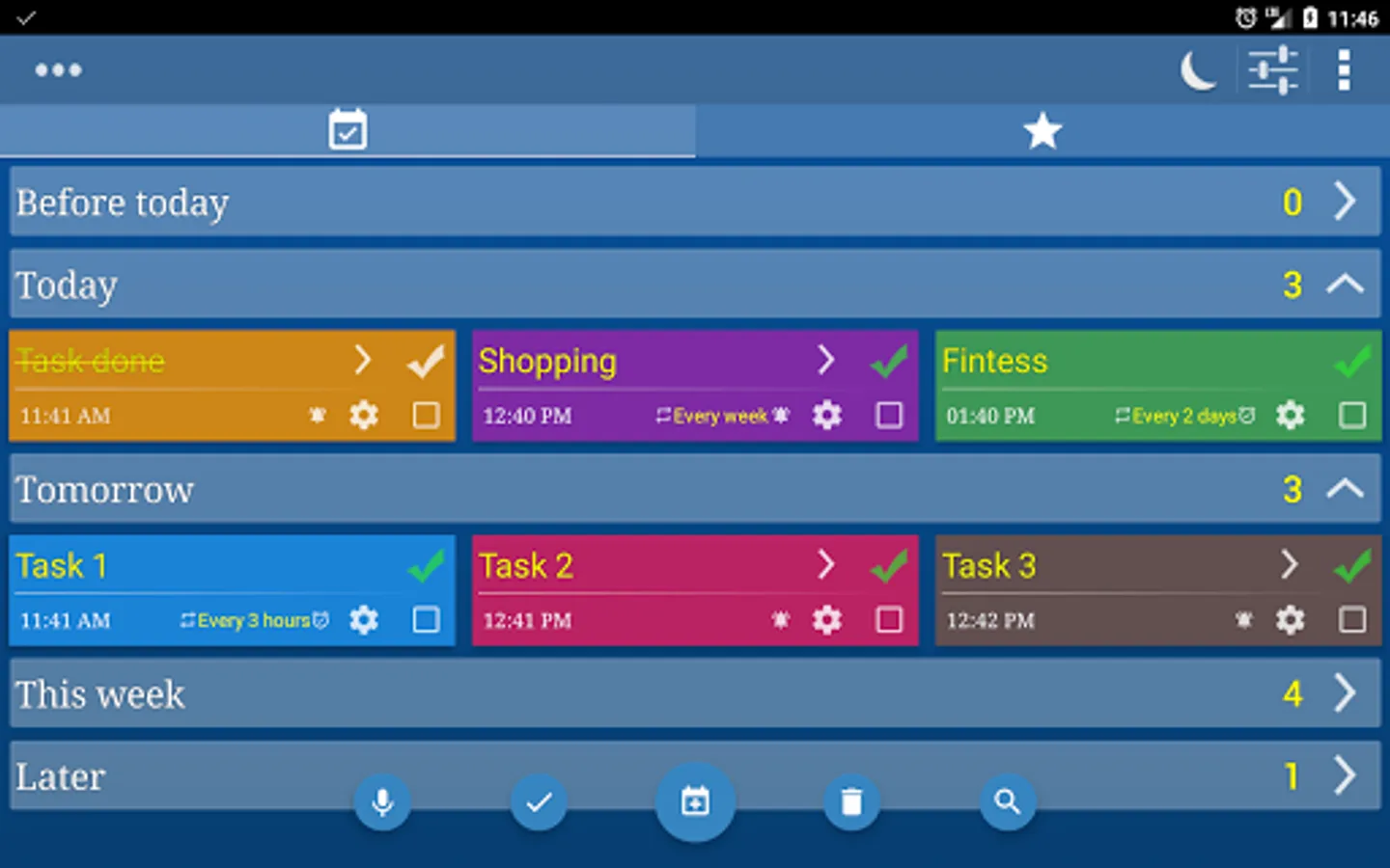✔ Tasks are organized chronologically to five tabs (Before today, Today, Tomorrow, This week, Later).