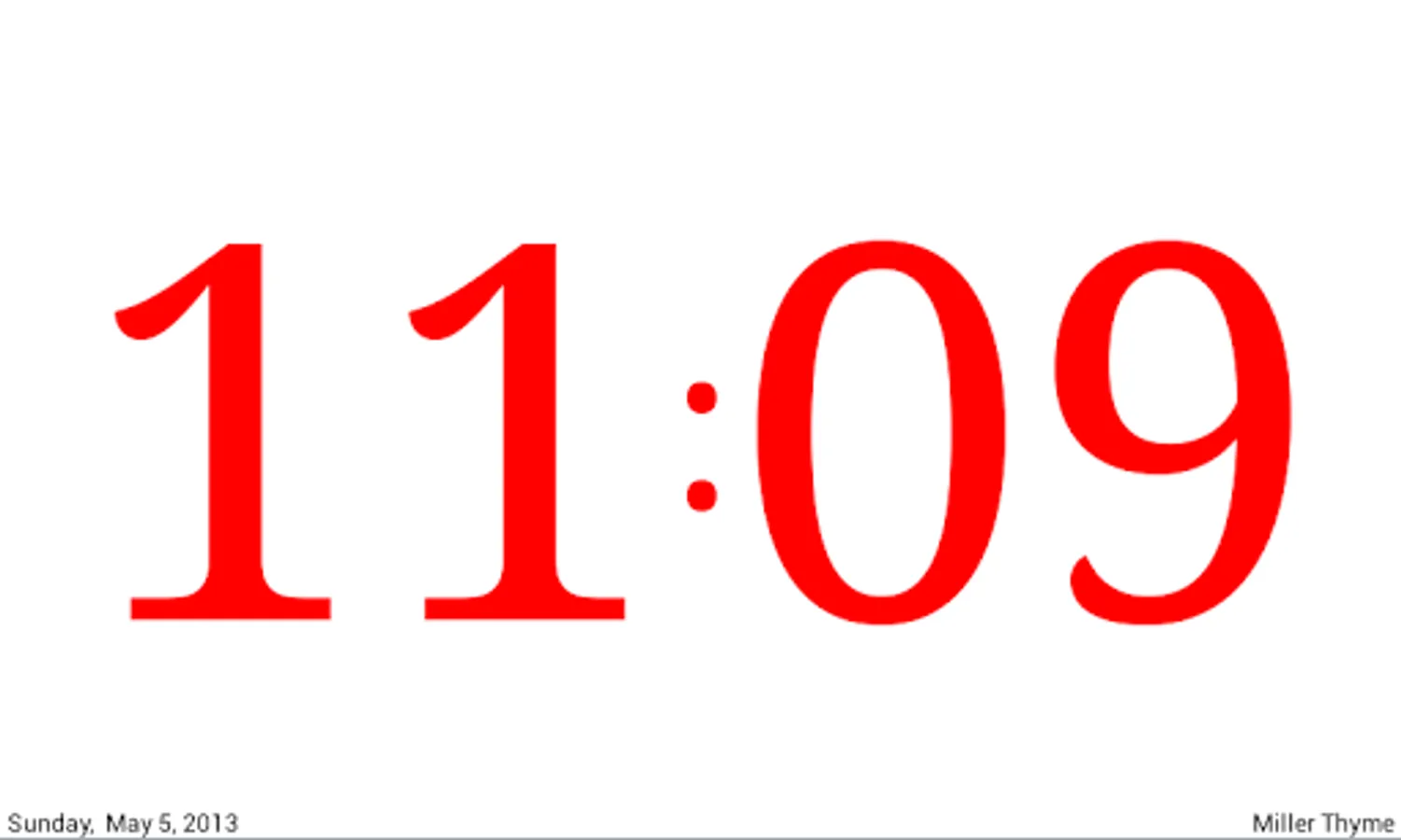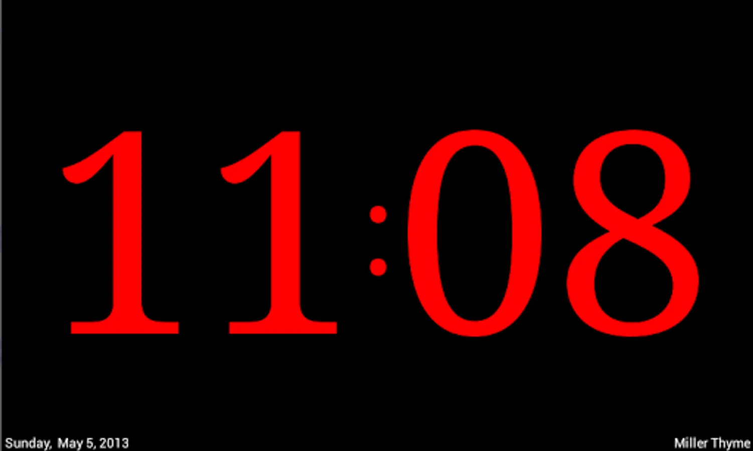 A simple bedside clock for night time use. Shows nothing but the time in very large digits so you can see it even without your glasses or contacts! Simple, easy to use. Just start it while you charge your device overnight. Be sure to plug it in or it will run your battery down. Night light feature included -- just tap the screen. Text so large even King George can read it without his spectacles! Settings for text color, size and brightness, date and time format, and battery conservation.