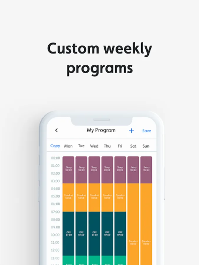 • Weekly program with pre-defined modes(Comfort, Sleep, Away & OFF)