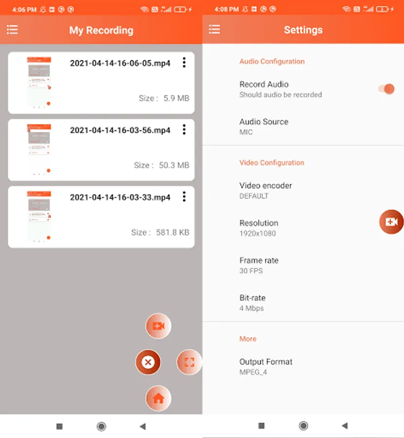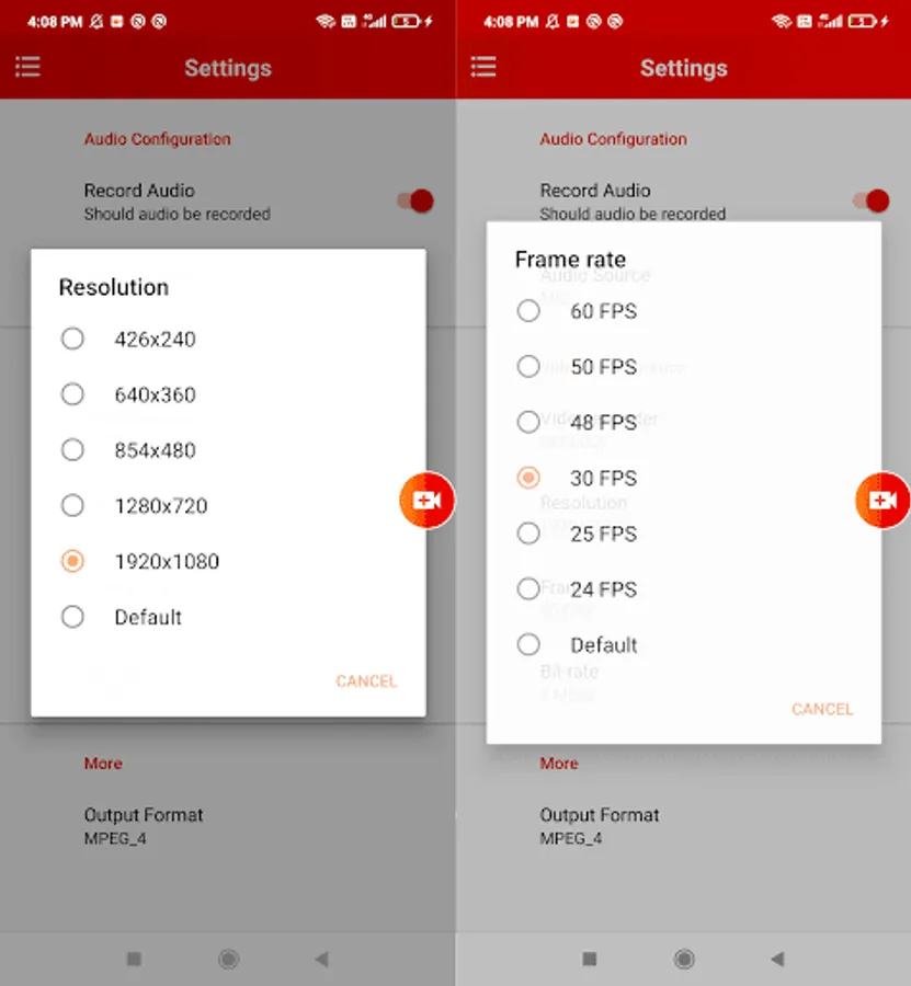 Screen Recorder - Million Recorder, Video Recorder with audio supports recording game screen in the highest quality, 1080p, 12Mbps, 60FPS. Of course, you can record screen with adjustable resolution (240p to 1080p), quality, and FPS(15FPS to 60FPS).