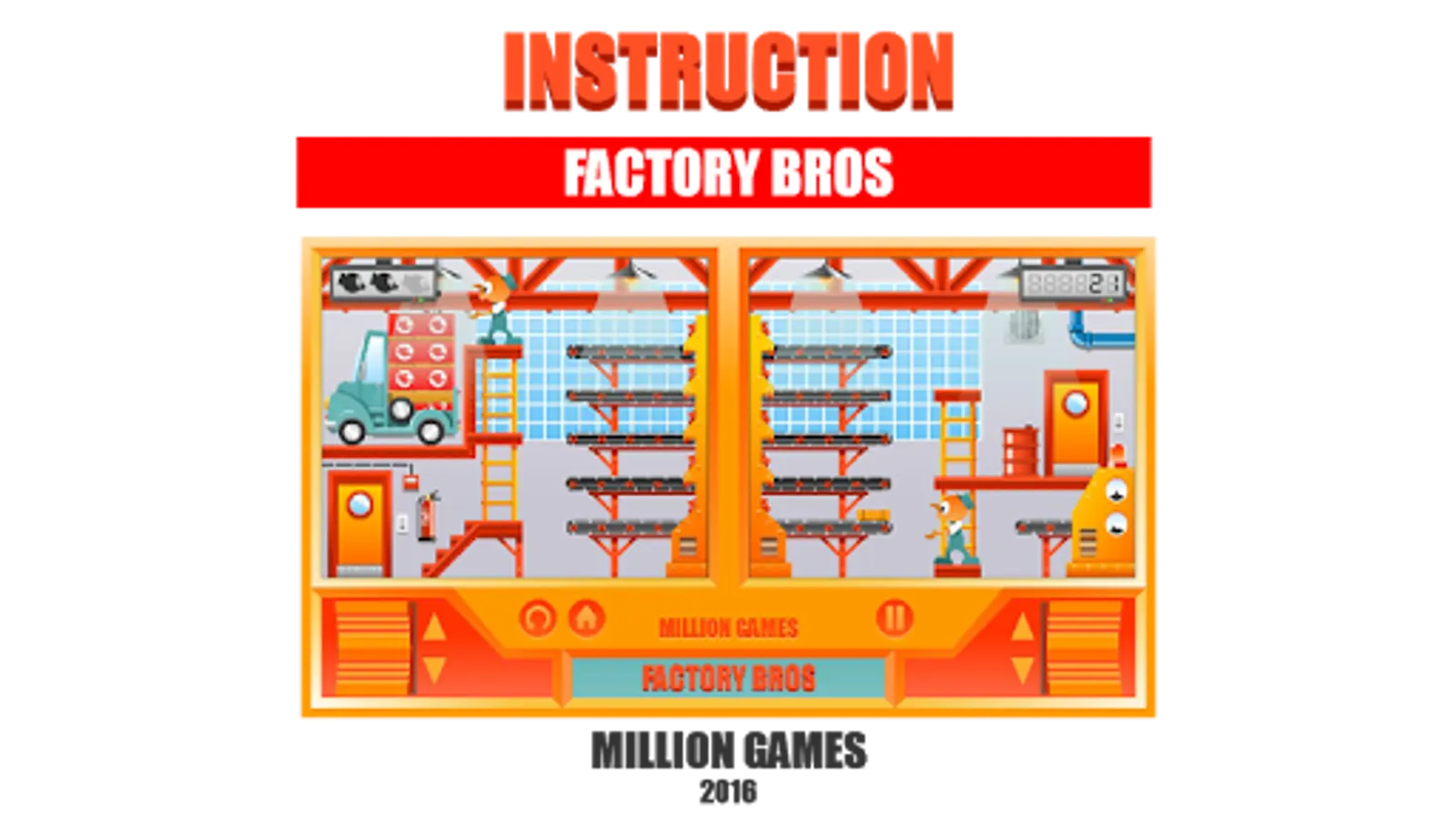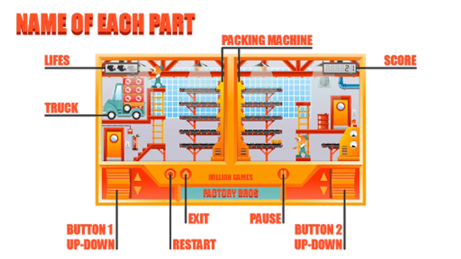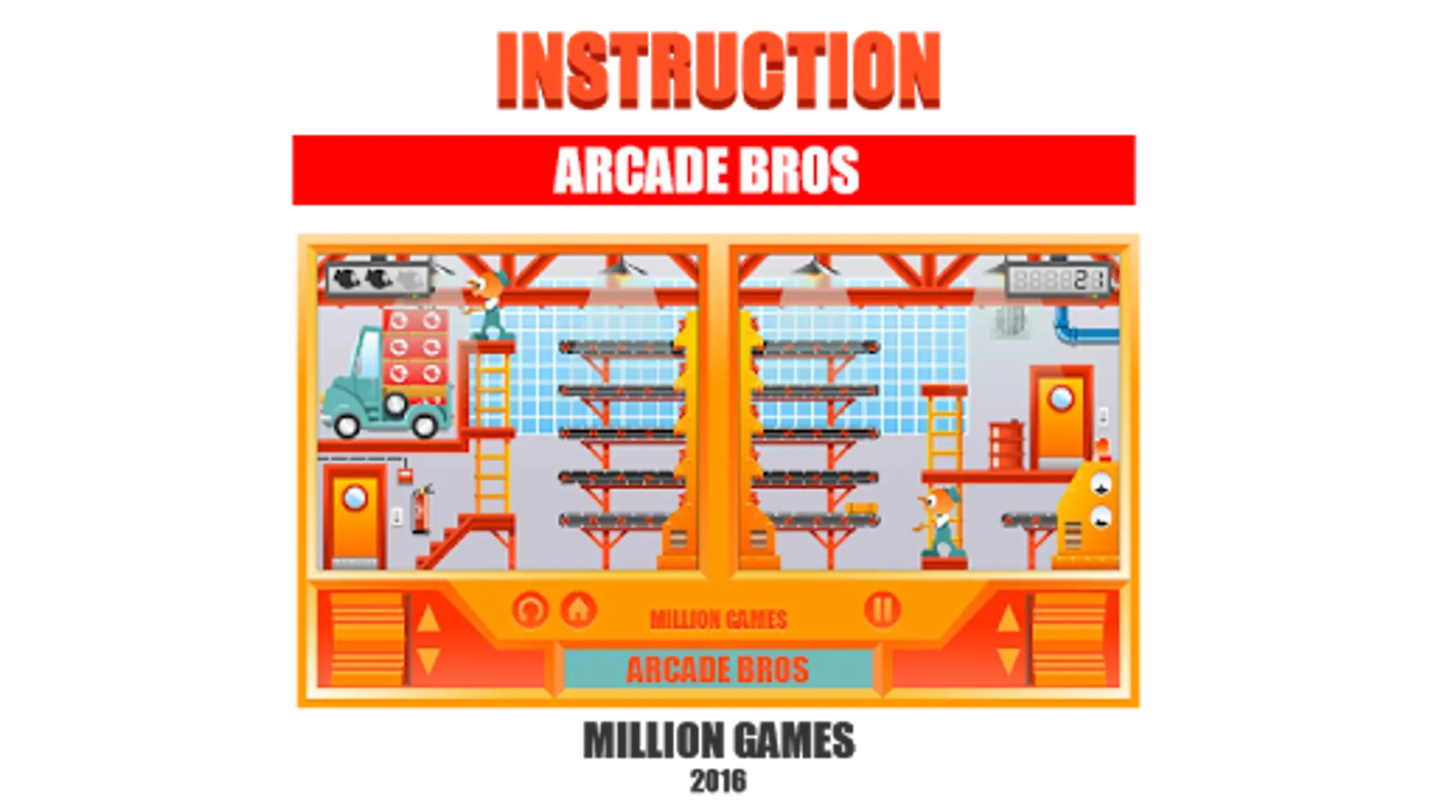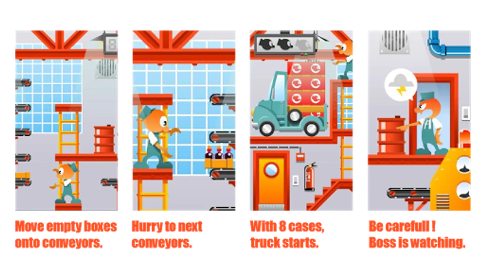 When boxes get to the last conveyor belt are loaded into the truck. When there are eight in the truck, then the engine starts and ARCADE BROS can go to take a break, but if boss turns up, then it’s time to get back to work.