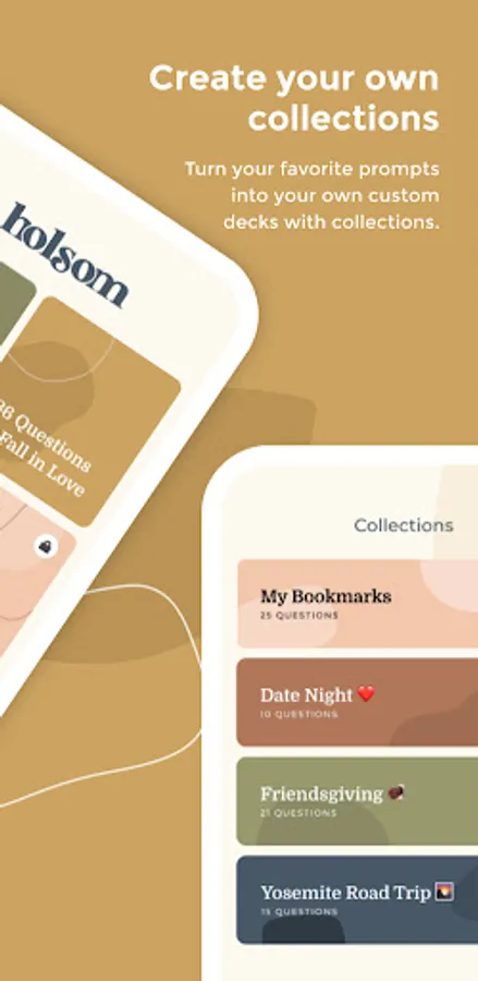 Holsom is perfect for every occasion, from hangouts, first dates, road trips, parties, friendsgivings, girls nights, date nights with your partner, hangouts with the boys, and more! Whatever the setting, you will find great conversation questions and prompts for every event. On the Holsom app, you will find different decks to help you build deeper relationships.
