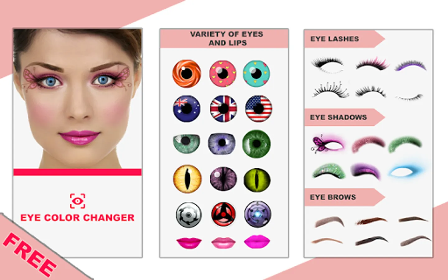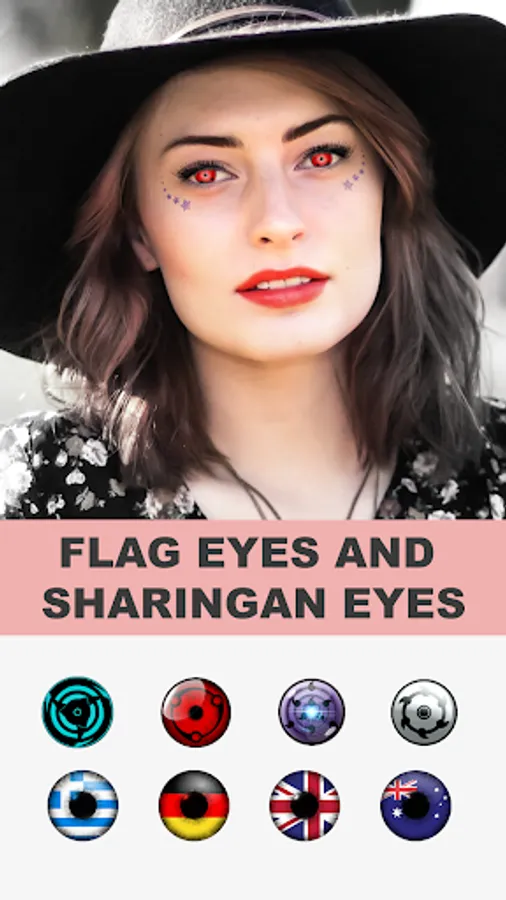 - Eye lens color changer has lenses like scary, blue, red, animal eye, flag and so on.