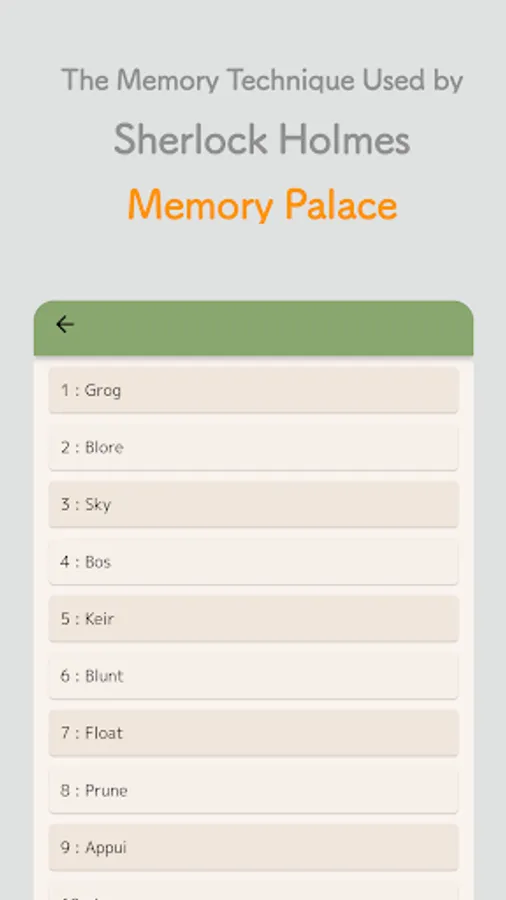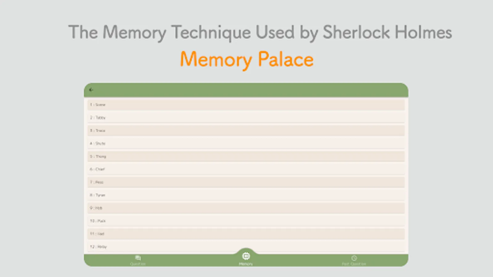 Palace Walk allows you to practice memory techniques known as the Memory Palace, Mind Palace, Method of loci, or Journey Method.