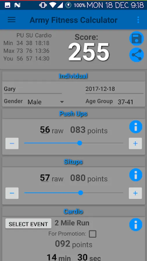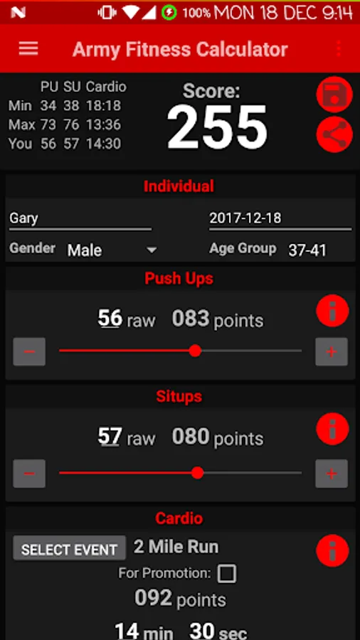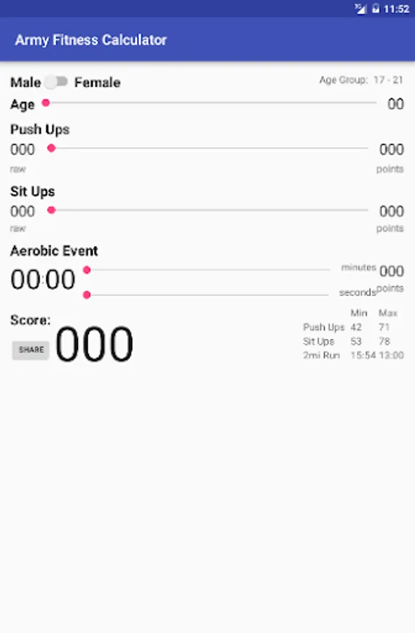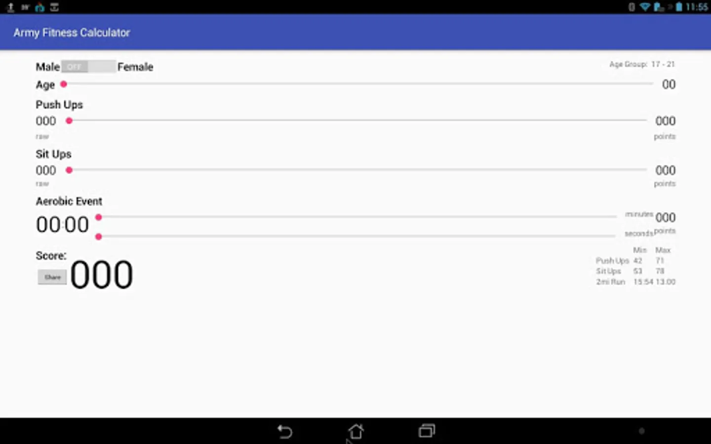 This Army Fitness Calculator is designed to be simple and easy to use. The Army Fitness Calculator calculates your Army Physical Fitness Test score according to FM 7-22. All information and ACFT/APFT scores update dynamically as you change your raw scores for each ACFT/APFT event. No dialog boxes popping up that require you to enter your data using a keyboard in this Army Fitness Calculator.